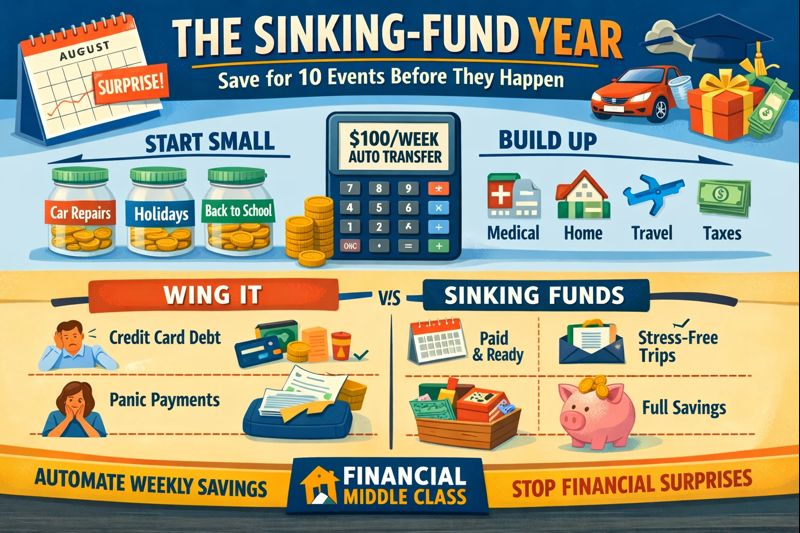 A sinking fund year is how you stop acting surprised by your own life. You pre-pay predictable events in small automatic chunks—$X per week—so when they show up, you don’t negotiate with your checking account like it’s a hostage situation.